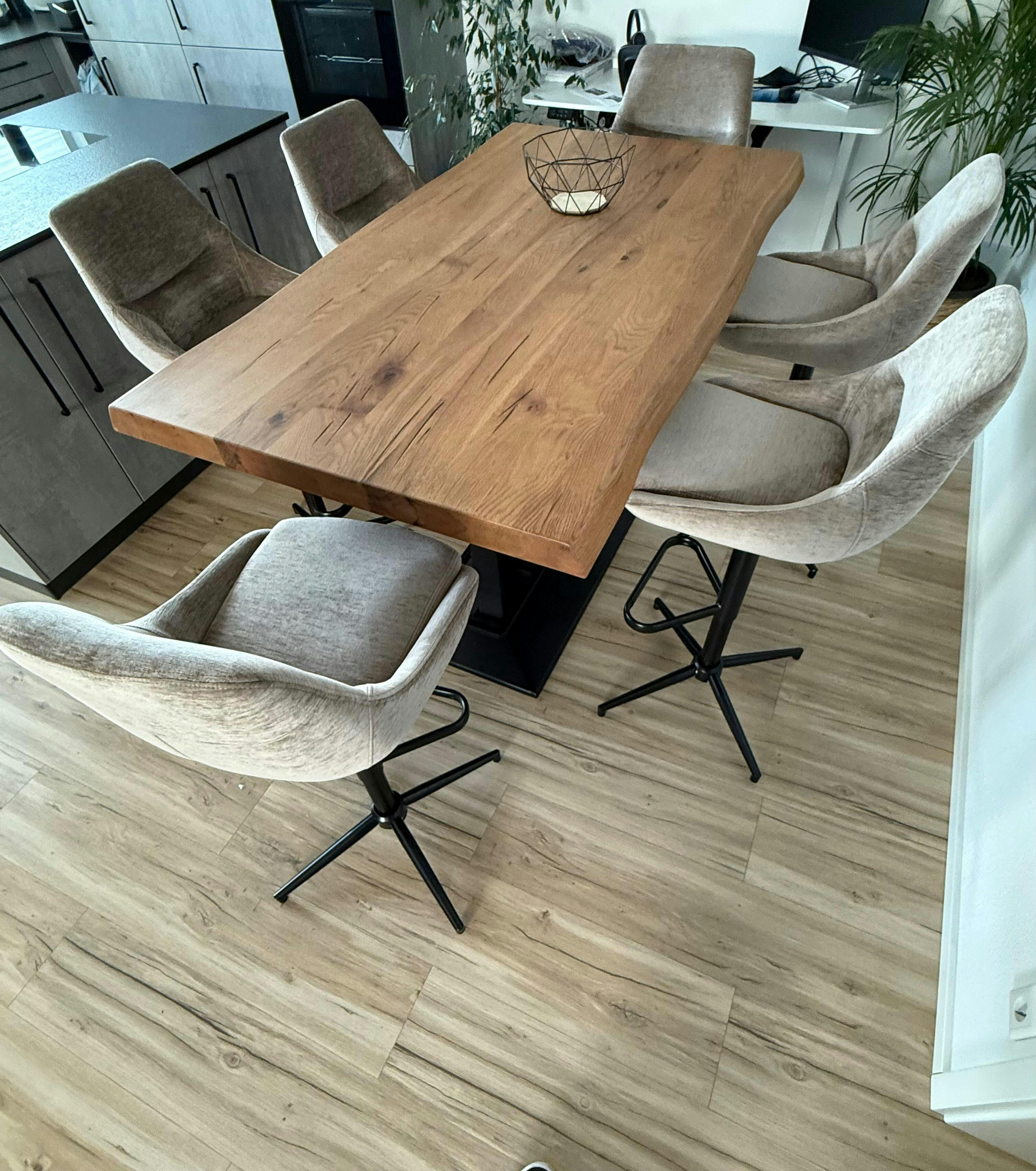 Die 6 cm starke Tischplatte aus rustikaler Wildeiche besticht durch ihre natürliche Baumkante und die gewollten Risse, die jedem Tisch eine einzigartige Optik verleihen. Diese charakteristischen Merkmale unterstreichen den massiven Charakter des Möbelstücks und sorgen für einen individuellen, handwerklichen Stil.