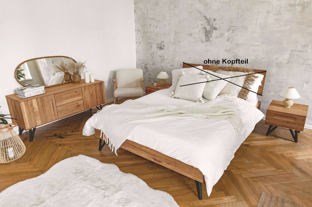 Das Massivholzbett Gent ohne Kopfteil besticht durch seine klare, moderne Formensprache und die natürliche Ausstrahlung von geöltem Eichenholz. Durch den Verzicht auf ein Kopfteil wirkt der Bettrahmen besonders luftig und leicht – ideal für minimalistische Schlafzimmer oder Räume mit Dachschrägen und Fensterwänden.