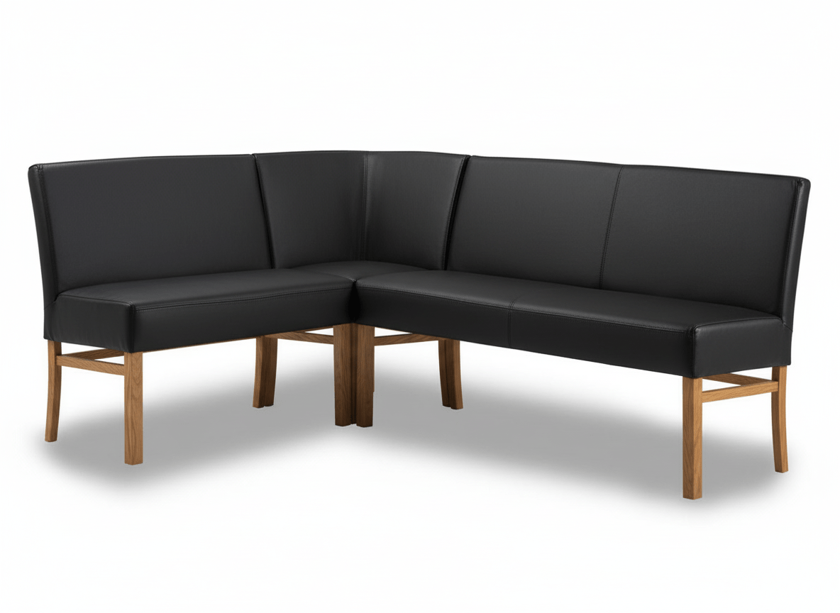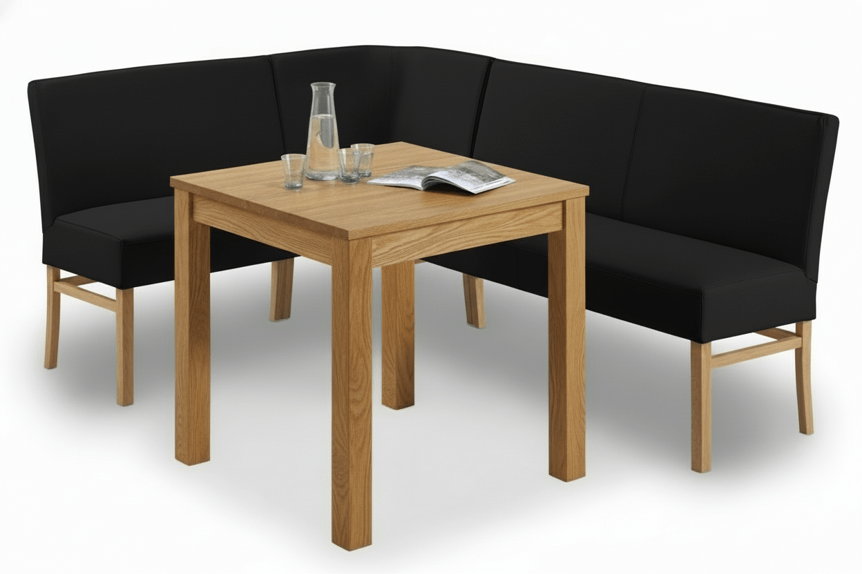 (Die Eckbank ist im Leder Toledo Nero und Kalahari mit geölten Eiche Beinen abgebildet.)