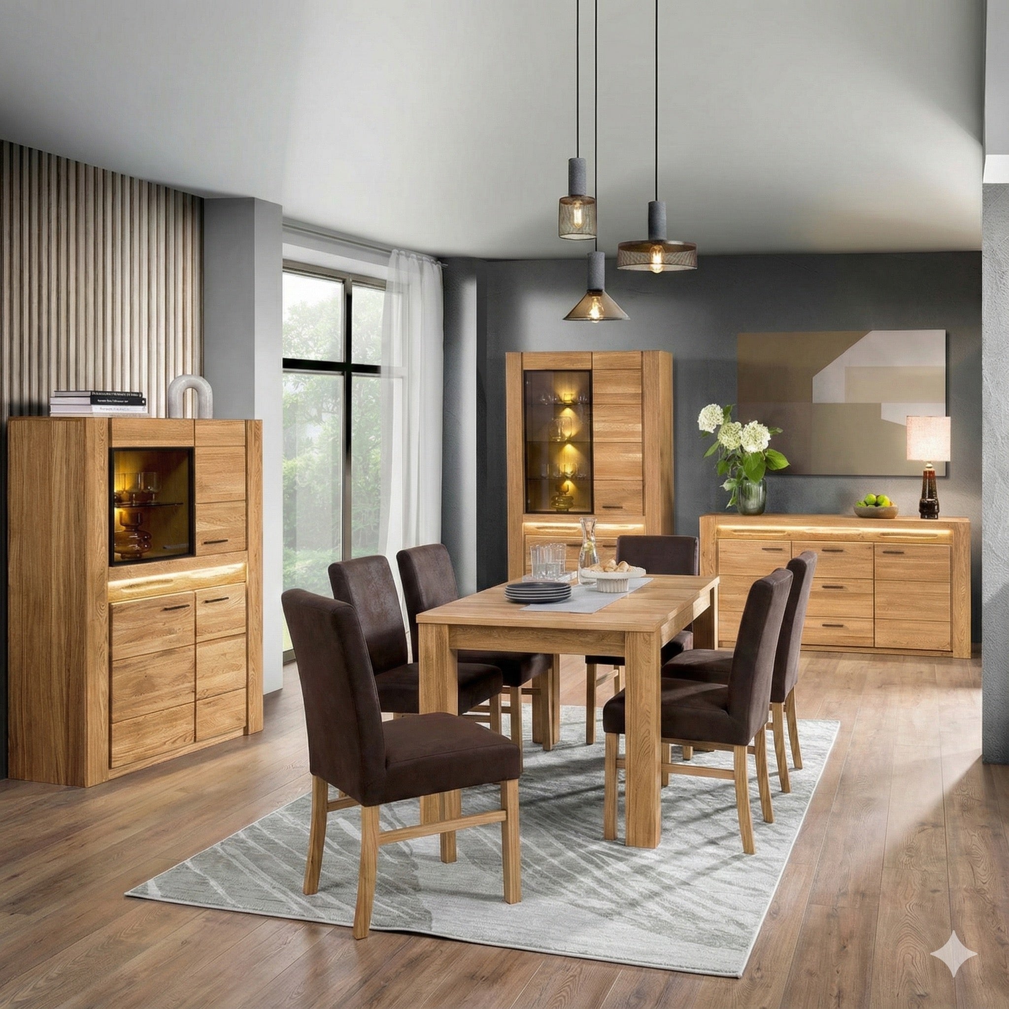 Ein besonderes Highlight der Kastenmöbel sind dekorative Ausfräsungen in den Fronten, welche eine gebürstete Struktur aufweisen und hinterleuchtet werden können, um die natürliche Schönheit des Massivholzes zu betonen.