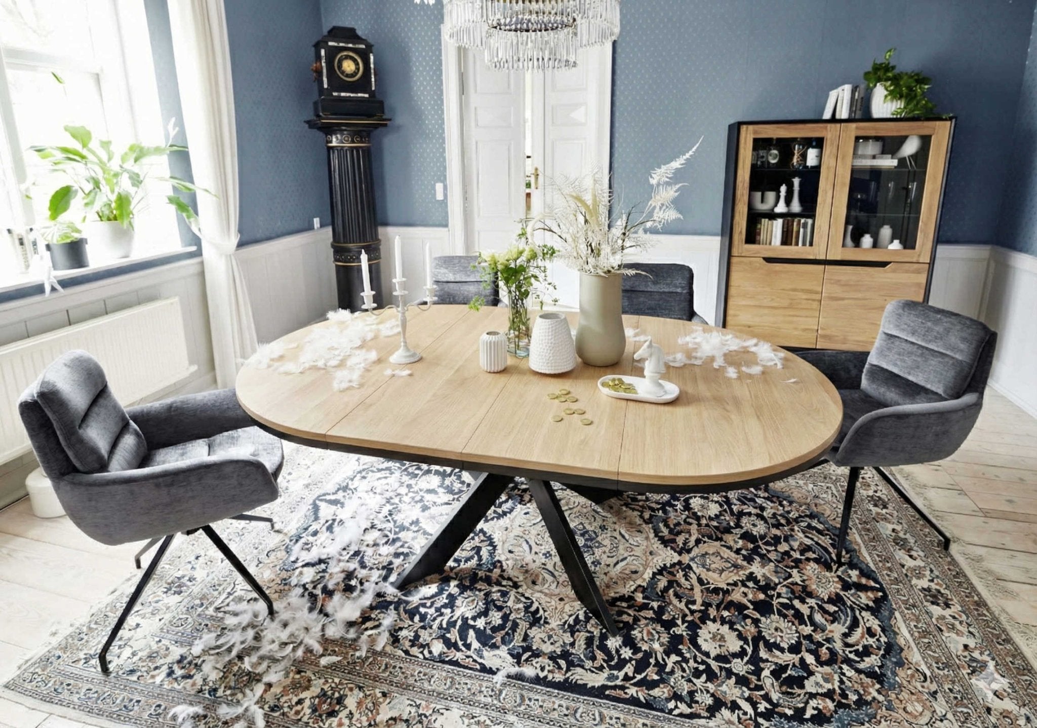 Ob Familienessen, Dinner-Partys oder als repräsentativer Arbeitsplatz – dieser Tisch passt sich nahtlos Ihrem Lebensstil an und wird zum Blickfang in jedem Raum. Verwandeln Sie Ihr Esszimmer in einen Ort, der Funktion, Ästhetik und Persönlichkeit perfekt vereint. Dieser ausziehbare runde Esstisch ist mehr als ein Möbelstück – er ist ein Meisterwerk der Ingenieurskunst mit individuellem Charakter. Erleben Sie die perfekte Symbiose aus innovativer Technik, zeitlosem Design und natürlicher Schönheit. Jeder Tisch erzählt seine eigene Geschichte durch die einzigartigen Strukturen seiner Oberfläche.
