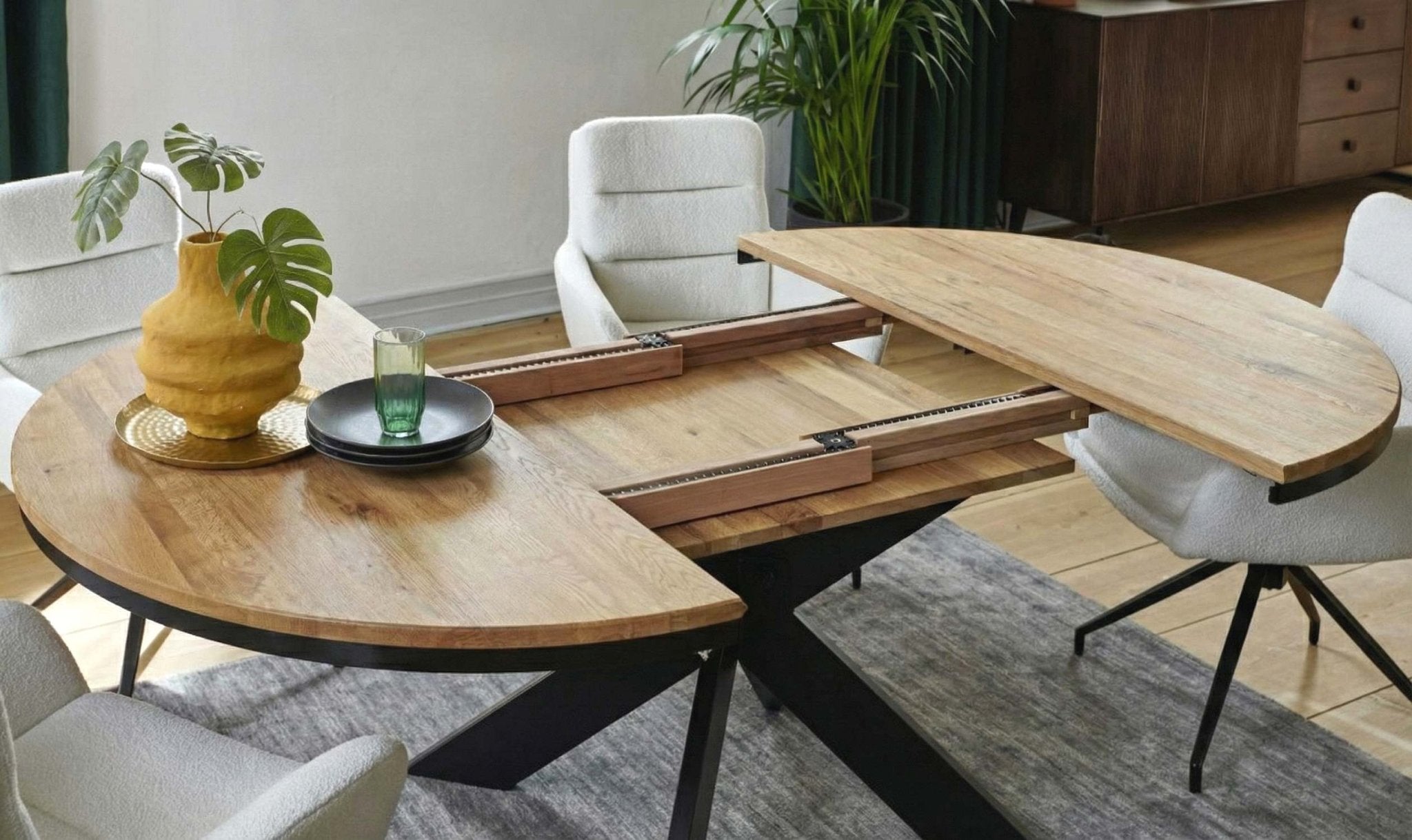 Maximale Flexibilität: Erweitern Sie Ihren Tisch mühelos mit zwei Einlegeplatten pro Seite, für insgesamt vier zusätzliche Segmente.