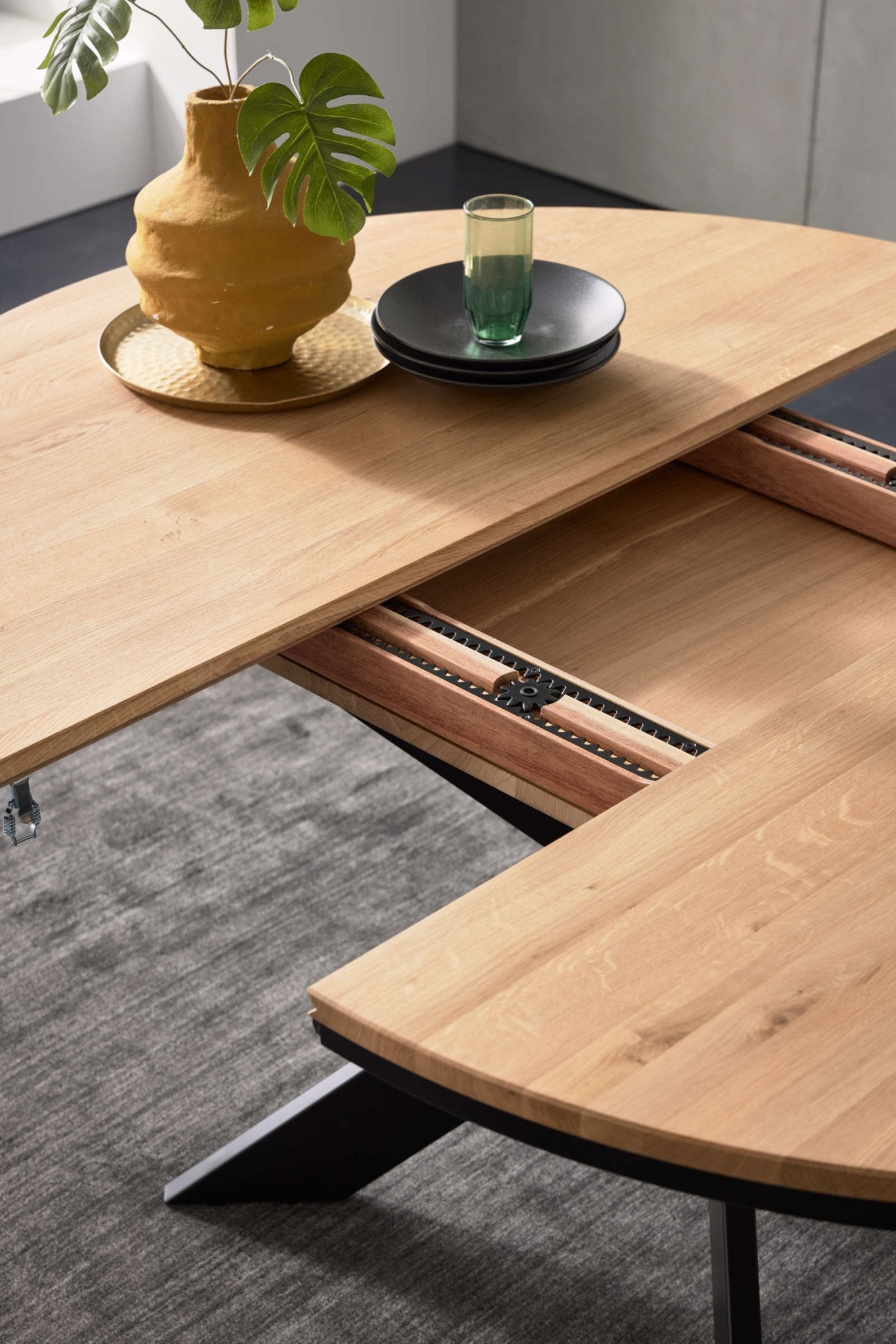 Einzigartiger Parallelauszug: Erleben Sie Präzision in Bewegung. Beim Ausziehen einer Tischhälfte bewegt sich die andere synchron mit – ein Mechanismus, der oft kopiert, aber nie erreicht wurde.