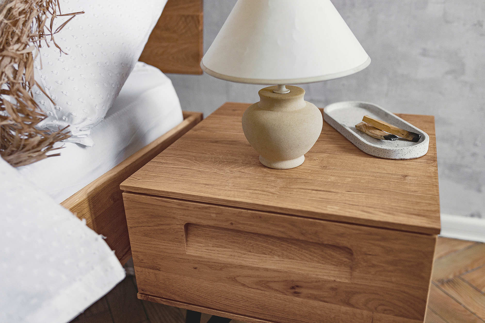 Wie das Bett Gent überzeugt auch der Nachttisch durch die durchgehende Lamellenverleimung des Eichenholzes. Diese sorgt nicht nur für Stabilität und Langlebigkeit, sondern auch für eine gleichmäßige, natürliche Holzstruktur. Mit seiner klaren Formsprache und warmen Ausstrahlung fügt sich der Nachttisch Gent perfekt in moderne Schlafzimmer ein – stilvoll, funktional und ausdrucksstark natürlich.