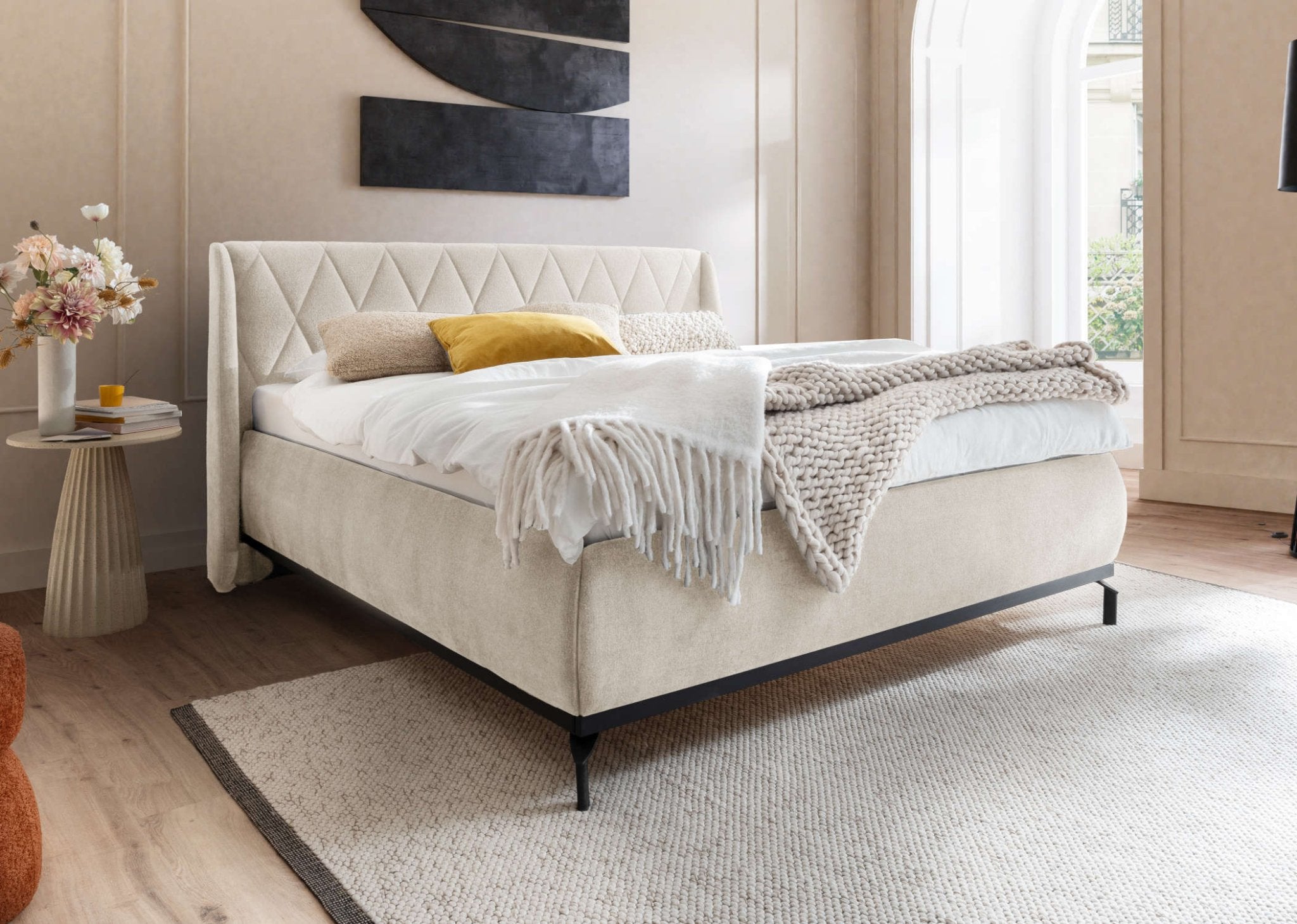 Das markante Kopfteil mit eleganter Rautensteppung ist nicht nur ein Blickfang, sondern bietet auch bequemen Halt – ob beim Lesen, Entspannen oder Träumen.