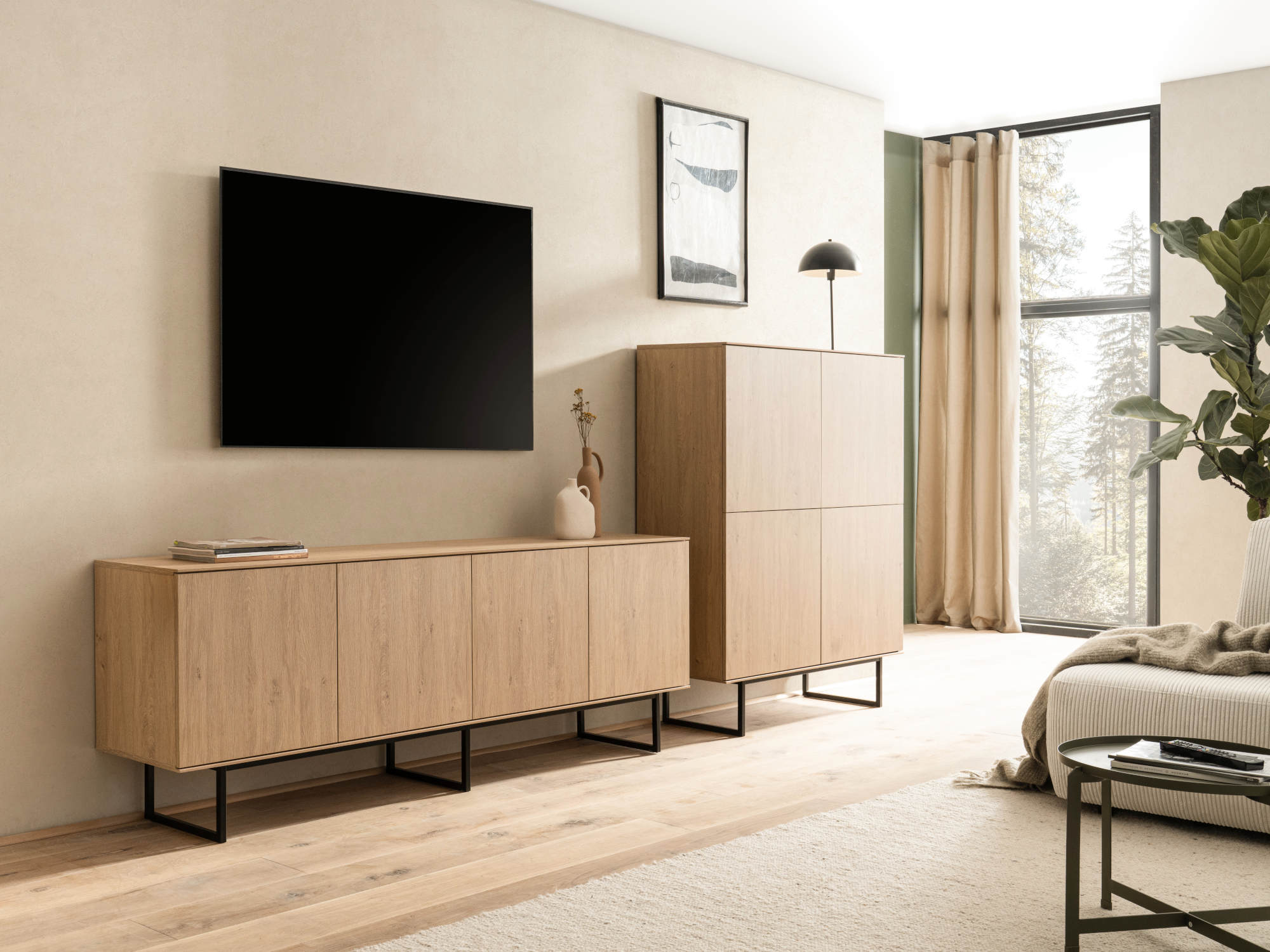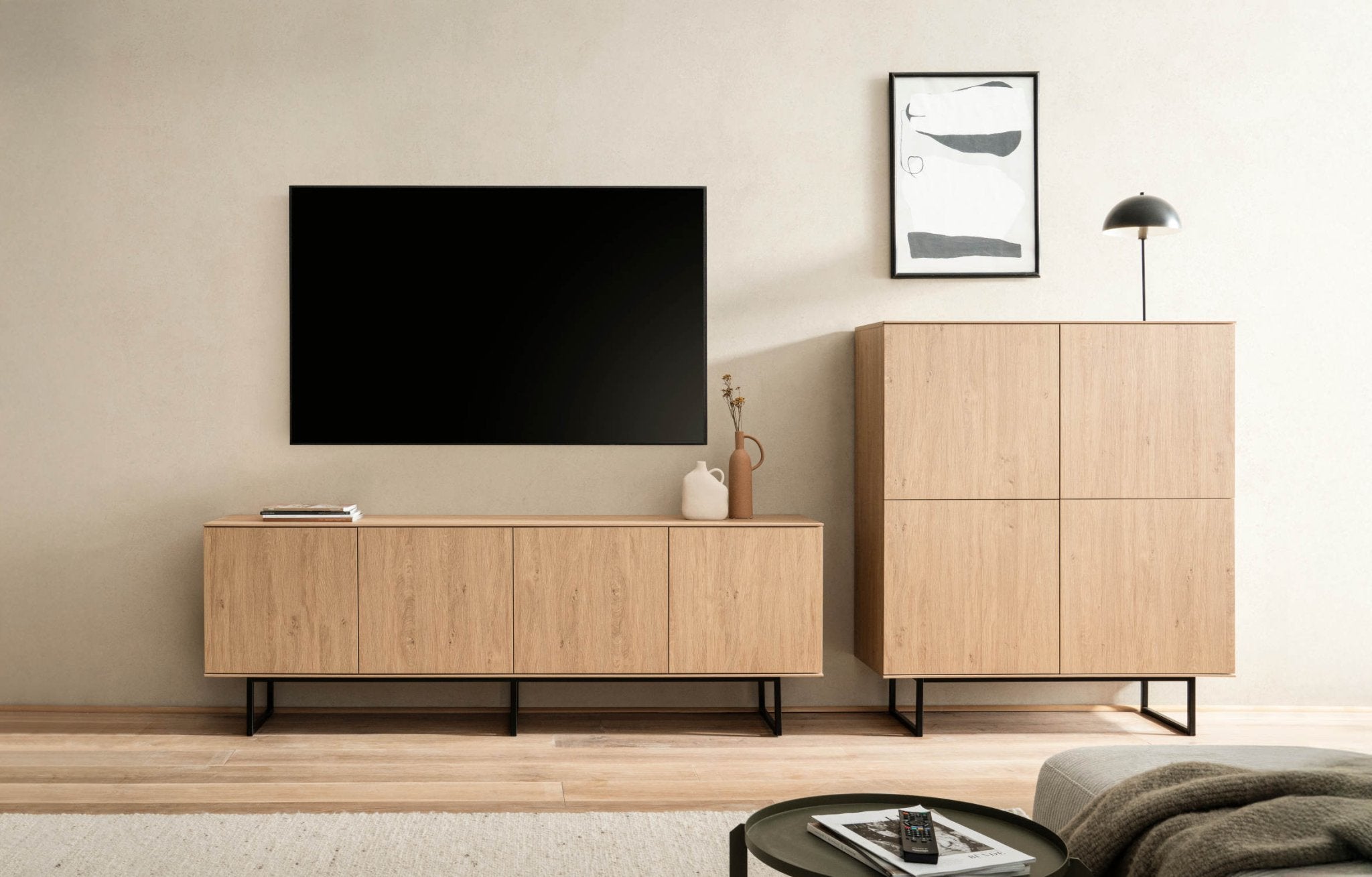 Moderner und großzügiger Stauraum: Dieses Wohnwand-Set aus zwei Möbelstücken in heller Eiche überzeugt mit viel Platz, variablen Einlegeböden und praktischem push-to-open Mechanismus.