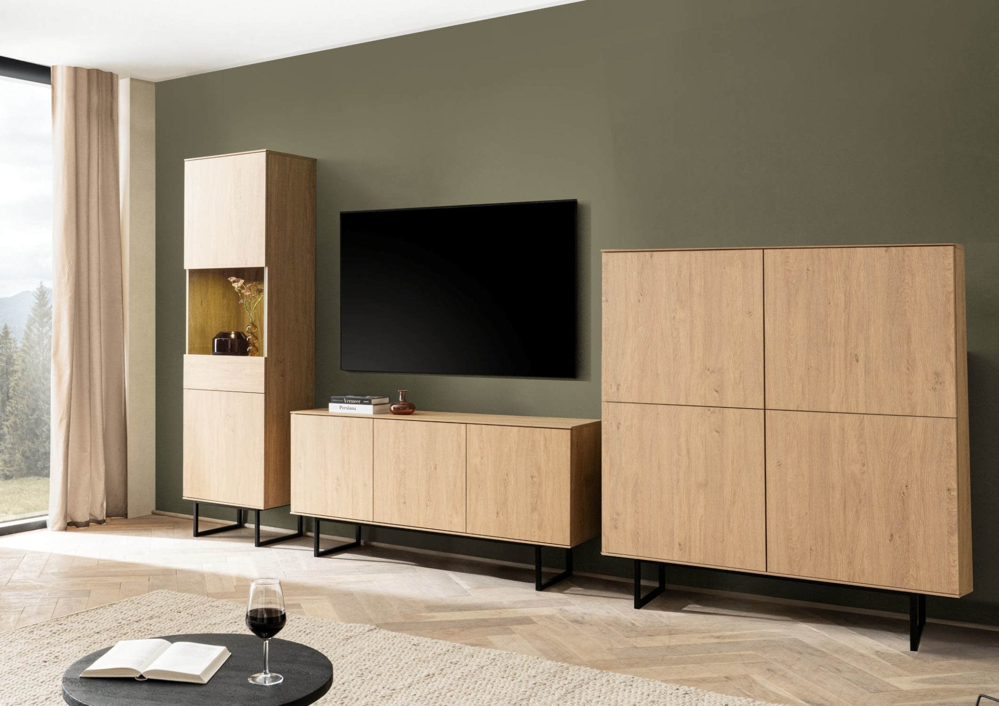 Dreiteilige Wohnwandkombination in Eiche Stone und Glas, mit optionaler LED-Beleuchtung für stimmungsvolle Akzente und flexiblen Stauraumlösungen.