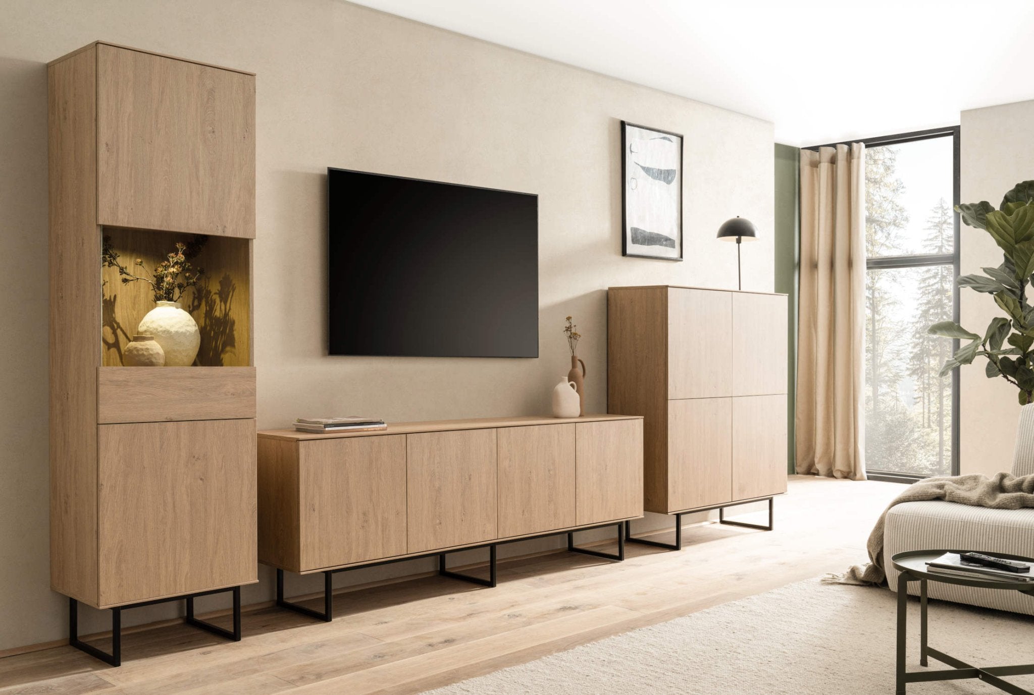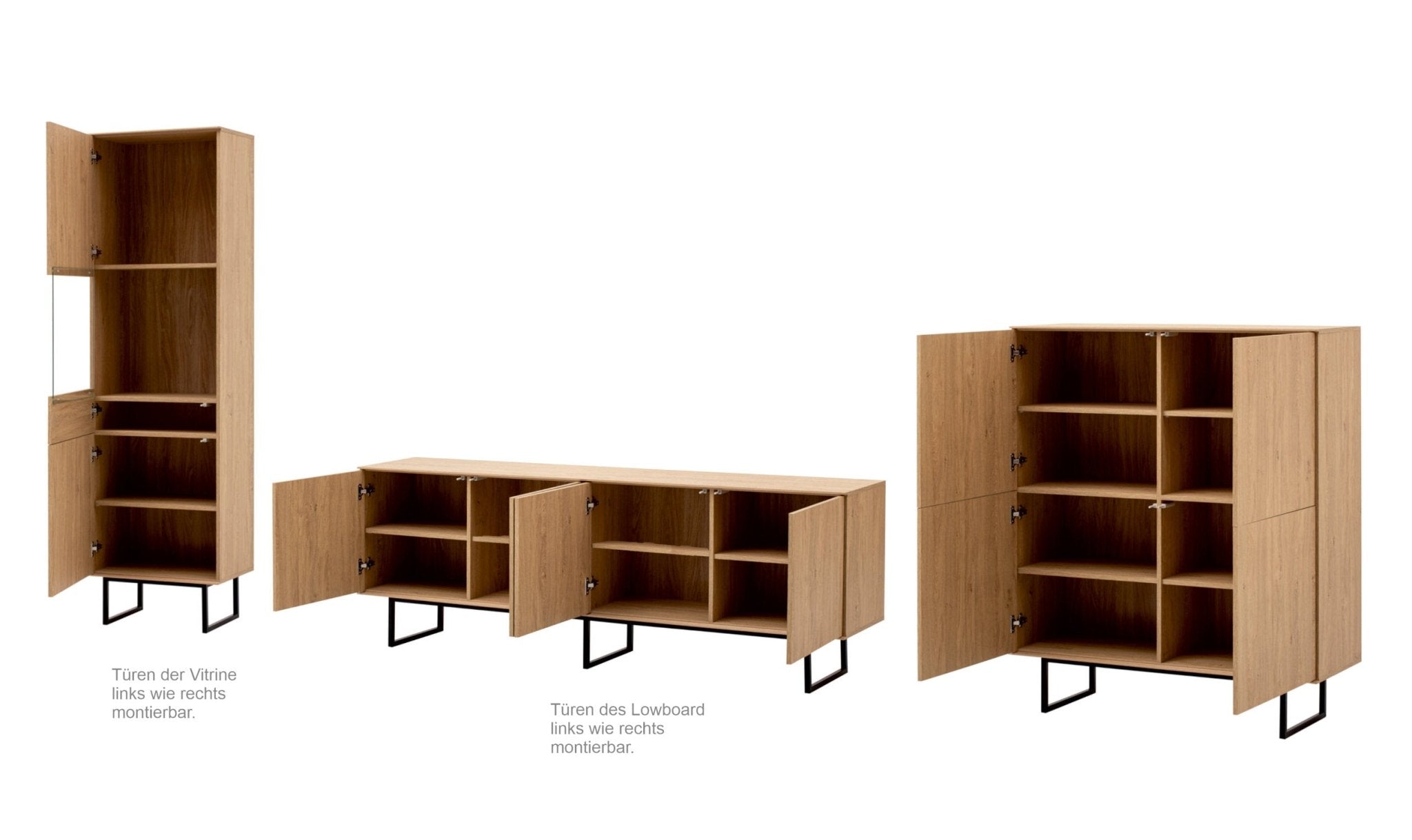 einem Vitrinenschrank mit Glastür und optionaler LED-Beleuchtung sowie einem großen TV-Lowboard und 4-türigem Highboard.