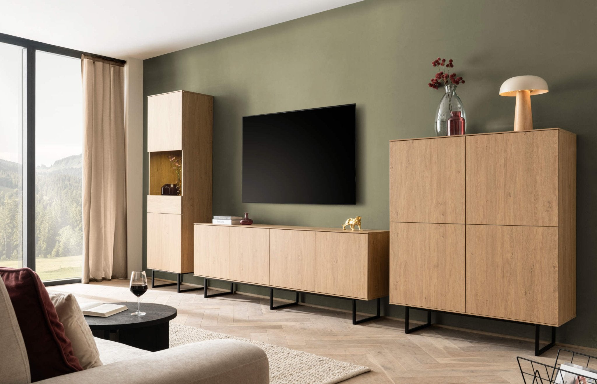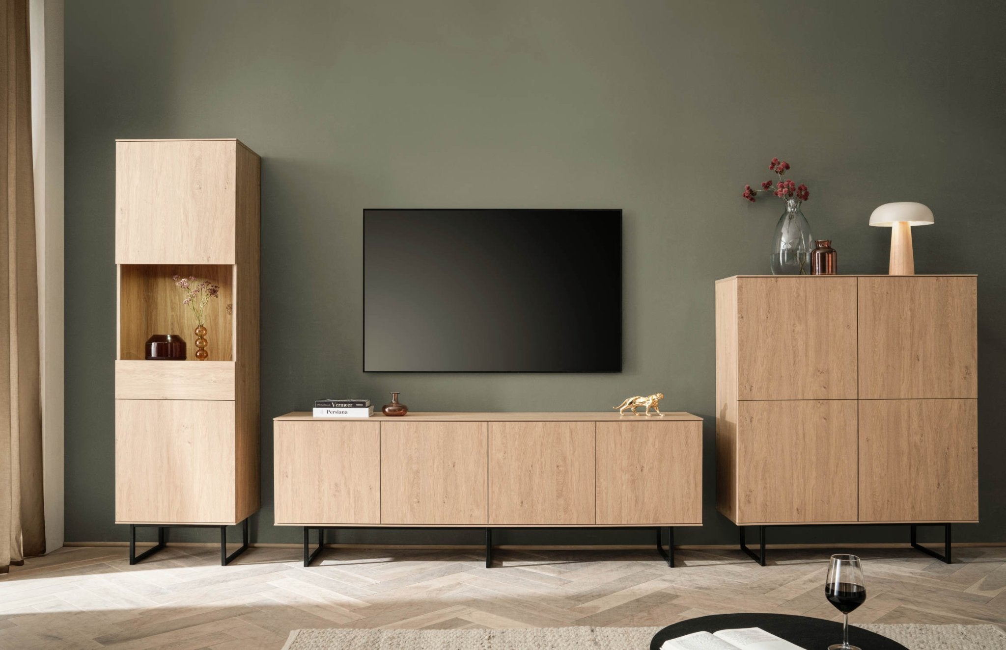 Die Wohnwand überzeugt mit moderner Eichenholzoptik und stilvollen Glasdetails.