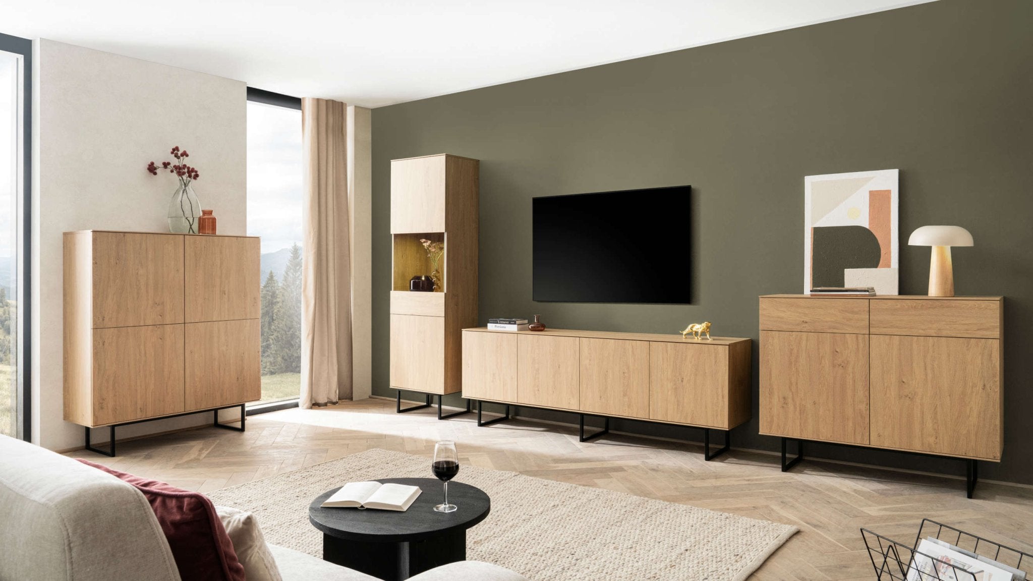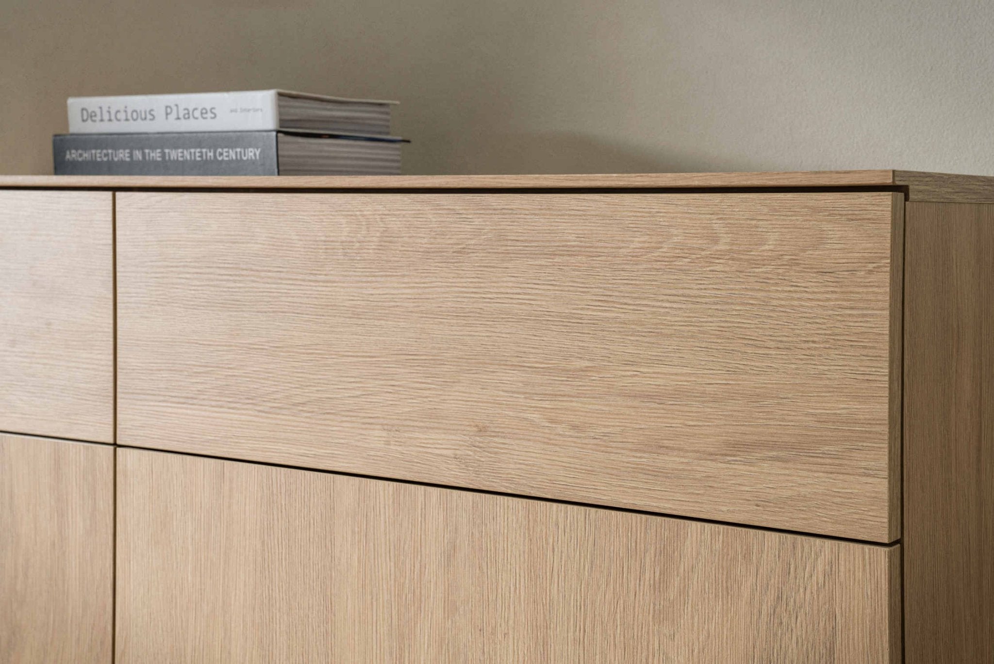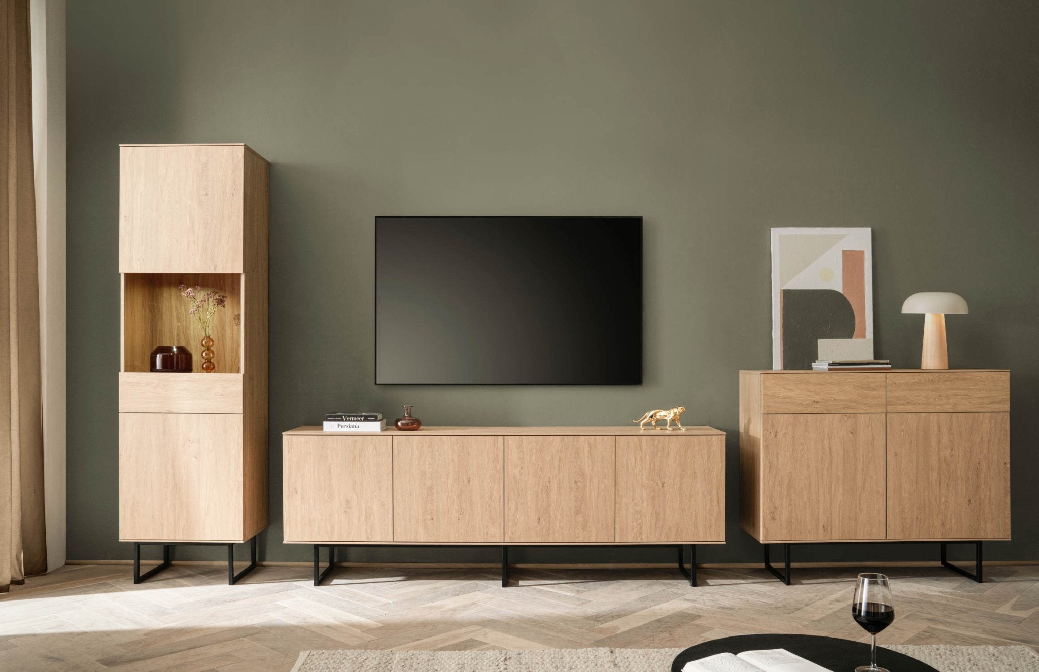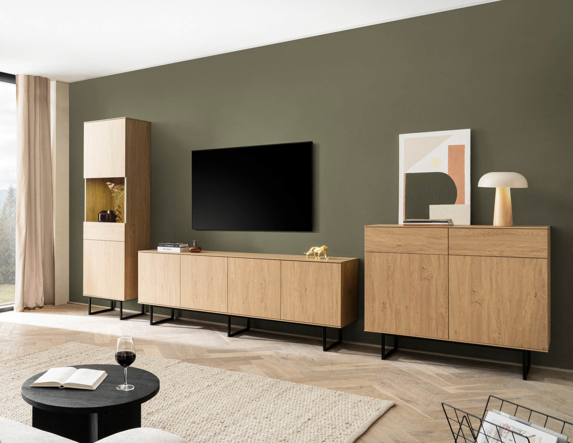 Exklusive dreiteilige Wohnwand in Eiche hell mit vielen Stauraummöglichkeiten, grifflosen Fronten und optionaler LED-Beleuchtung. Push-to-open Türen, Soft-Close Schubladen und flexibel einstellbare Fächer sorgen für höchsten Bedienkomfort.
