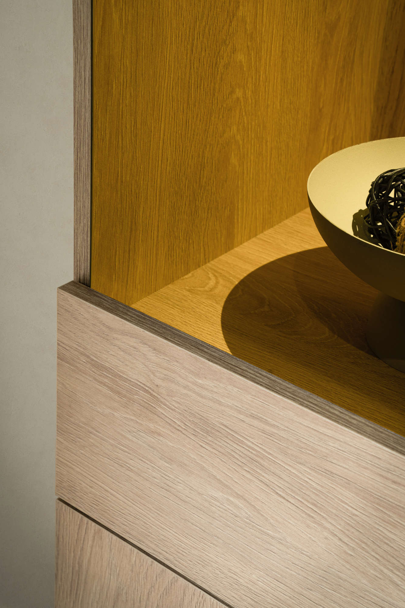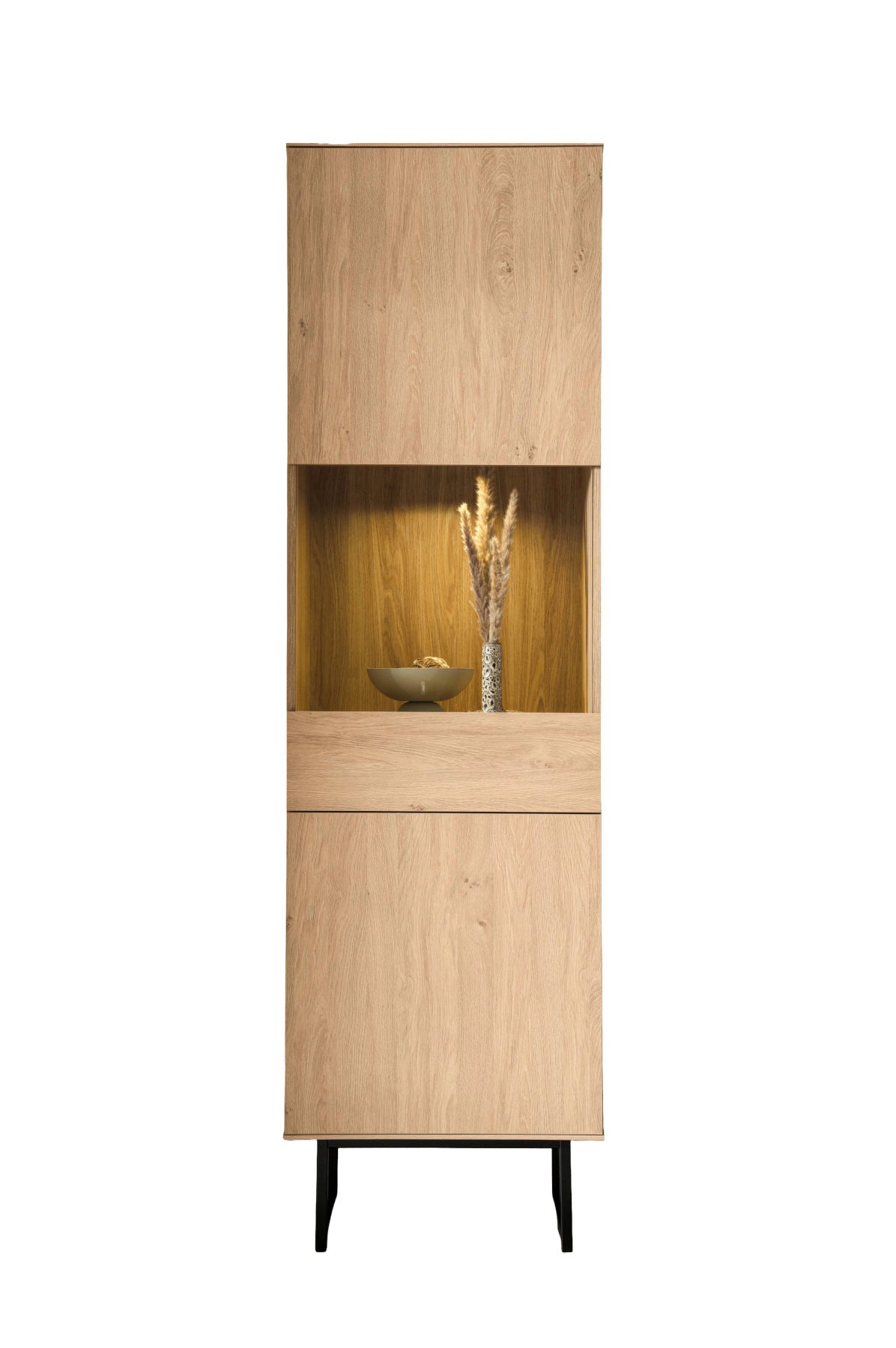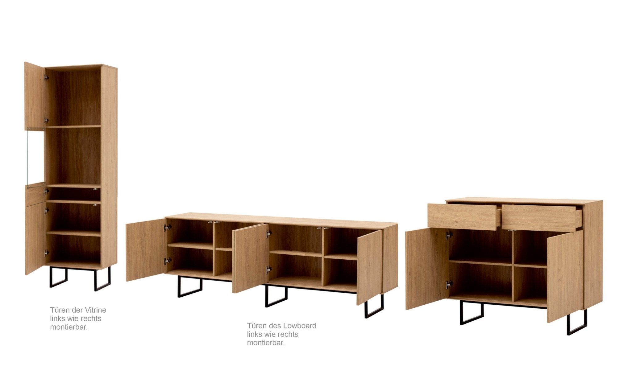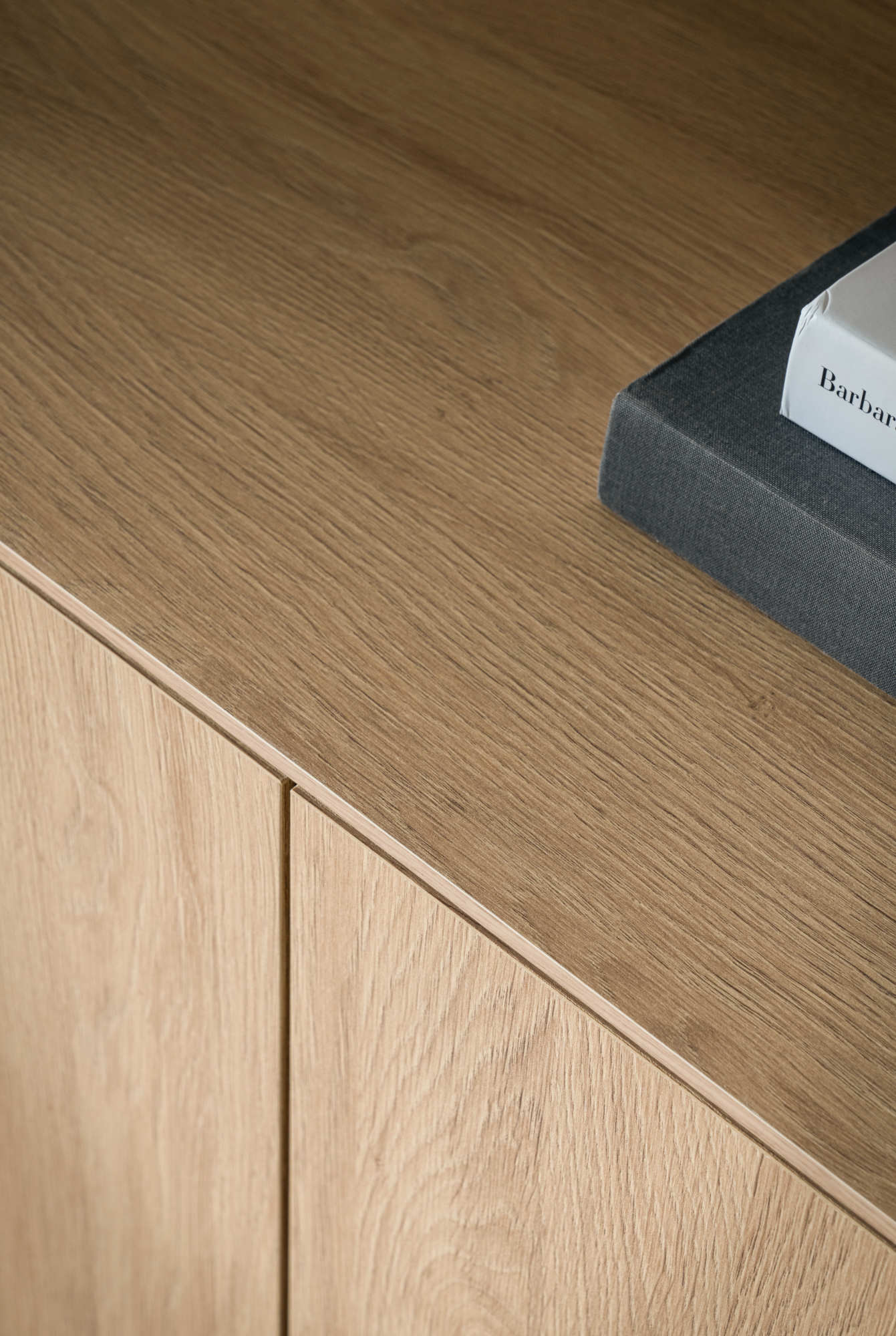 Exklusive dreiteilige Wohnwand in Eiche hell mit vielen Stauraummöglichkeiten, grifflosen Fronten und optionaler LED-Beleuchtung. Push-to-open Türen, Soft-Close Schubladen und flexibel einstellbare Fächer sorgen für höchsten Bedienkomfort.